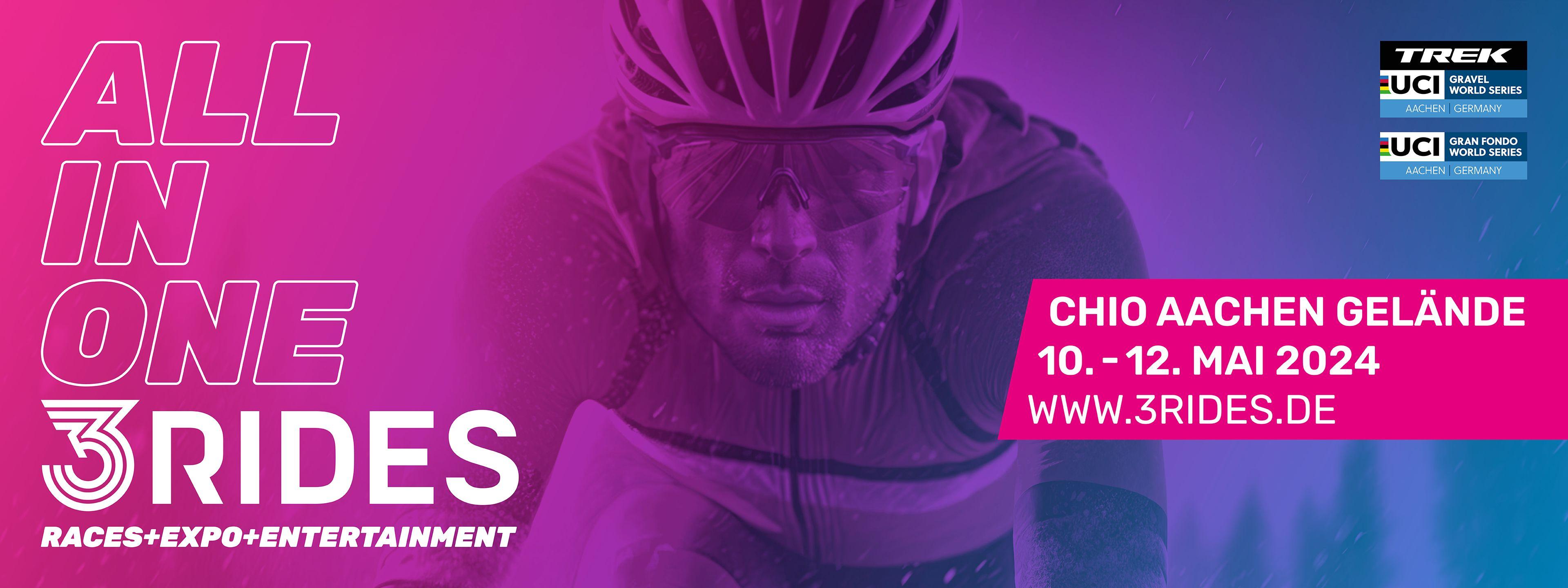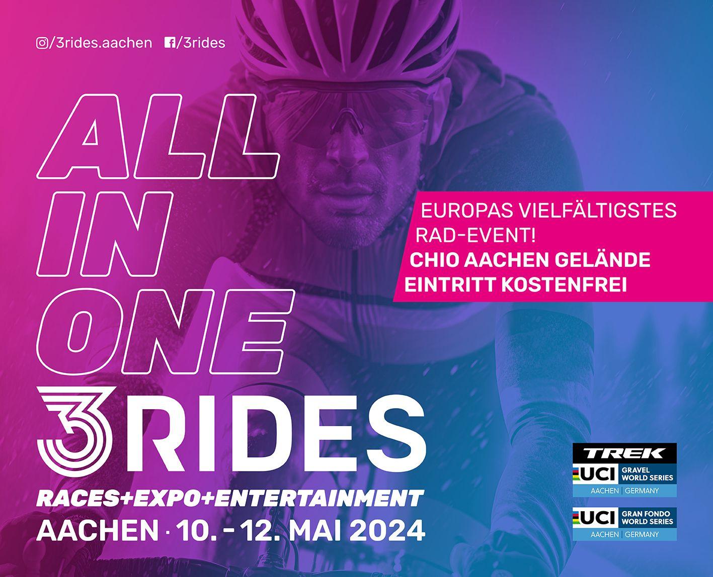 3RIDES hat sich zu einem internationalen Treffpunkt für Radprofis, Amateursportler, Hobbyfahrer und Familien, insbesondere aus Deutschland, den Niederlanden und Belgien, entwickelt. Neben einer Bike-Expo, Musik, einem Food-Market, verschiedenen Straßen- und Gravelfahrten und einem Gravel-Eliminator, sind die Starts des UCI Gran Fondo und der UCI Gravel World Series die absoluten Highlights der Veranstaltungswoche. Insgesamt werden 30.000 Besucher und 5.000 Teilnehmer aus über 40 Nationen erwartet.