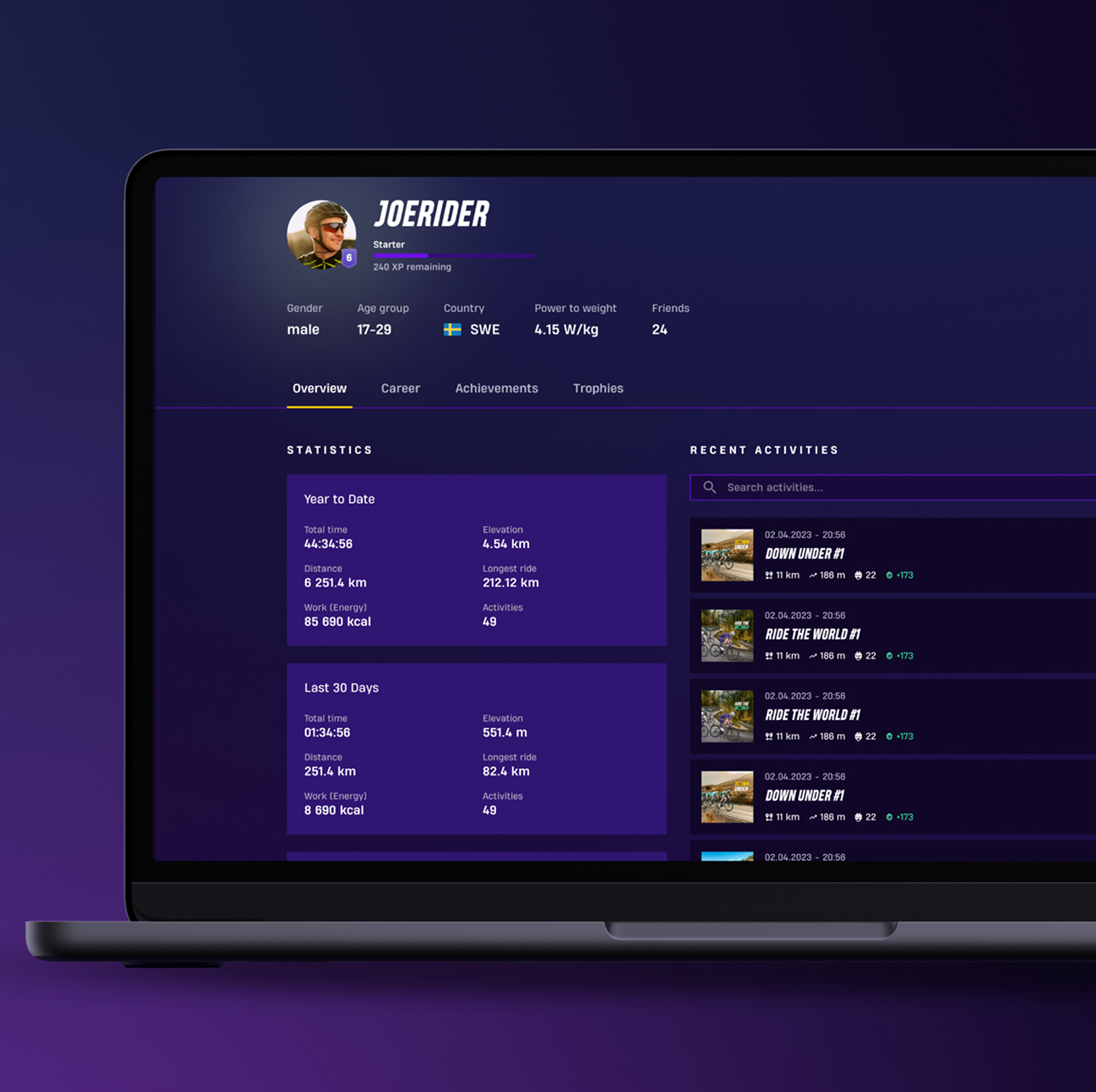 Your profile experience in the Riders Portal has been improved with a Recent activity feed that charts your daily progress. A new Achievements hub and Trophies collection shows everything you've unlocked in your career so far. You can also now view your friends' profiles by clicking on their icon from your home feed, friends list or leaderboards.