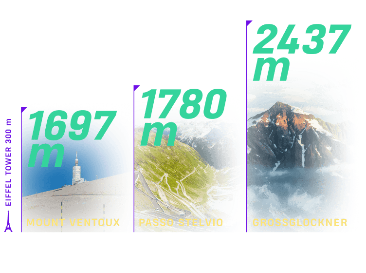 Take on the challenge of conquering three legendary alpine climbs: Passo Stelvio, Grossglockner, and Mount Ventoux.