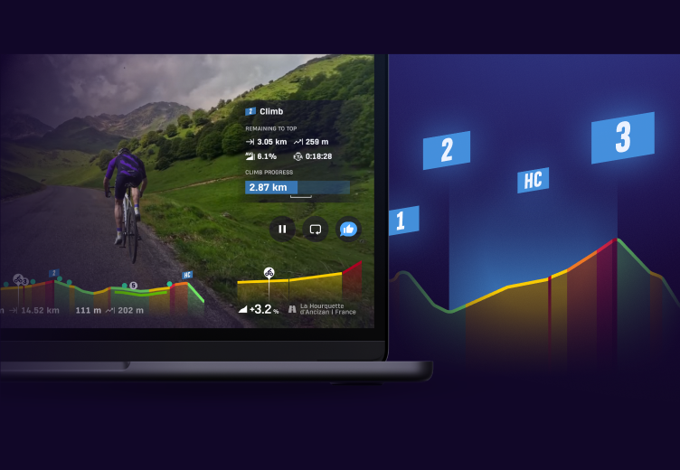 We’ve upgraded climbing with a global climb-categorization standard. You can now see each climb’s difficulty directly in the route profile in the app and on the Riders portal. On the route, a new climb widget shows key metrics in a real time to help you pace your effort. Climb segments are now fully aligned with the actual categorized climb, and each route contains only one climb segment - making it more challenging, more realistic and comparable across routes.