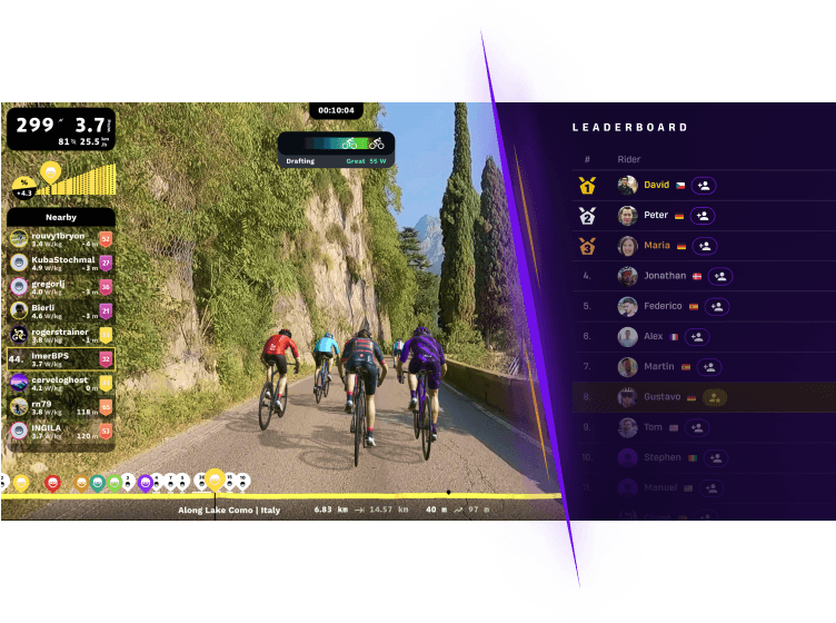 Easy-going group rides on ROUVY are a fun way to get together with other cycling buddies from all around the world. And if you feel like testing yourself, there are plenty of races to join.