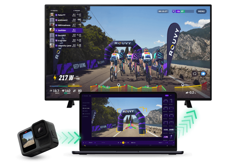 The ROUVY Route Creator is a first-of-its-kind platform that enables you to record cycling routes in high quality video, and then ride them virtually. All you need is a GoPro camera with GPS and the ability to mount it on a bike, e-bike, scooter, motorcycle or automobile.